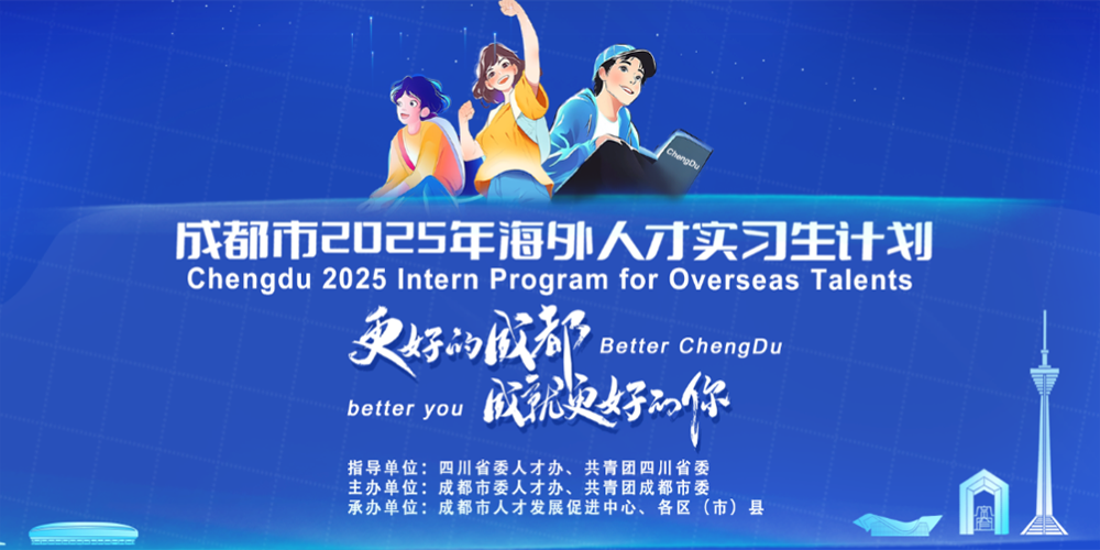 成都市2025年海外人才实习生计划活动 由四川省委人才办、共青团四川省委指导,成都市委人才办、共青团成都市委主办的国际大型青年实习活动,以聚焦 成都市重点产业链,面向海外知名高校招募硕(博)士青年人才 为目标,为参与活动的实习生提供岗位发展机会、城市文化体验、专业职业赋能,全程配套“实习实践+就业跟踪”人才成长陪伴式活动服务,助力怀揣梦想的青年筑梦成都、圆梦成都!